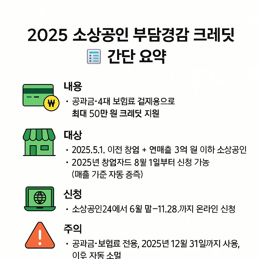 - 신청 사이트: 부담경감크레딧.kr 또는 소상공인24