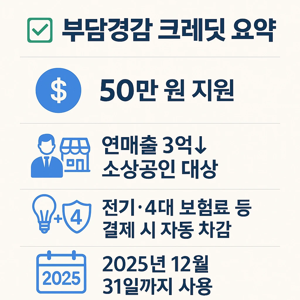 2025년 7월 14일부터 시작된 이 제도는 연 매출 3억원 이하 소상공인에게 50만원 상당의 크레딧을 지원해줍니다. 전기요금, 가스요금, 4대 보험료 같은 고정비에 바로 사용할 수 있어서 정말 실질적인 도움이 됩니다. 이 글을 끝까지 읽으시면 소상공인 부담경감 크레딧 신청부터 활용법까지 모든 것을 완벽하게 이해하실 수 있을 거예요.